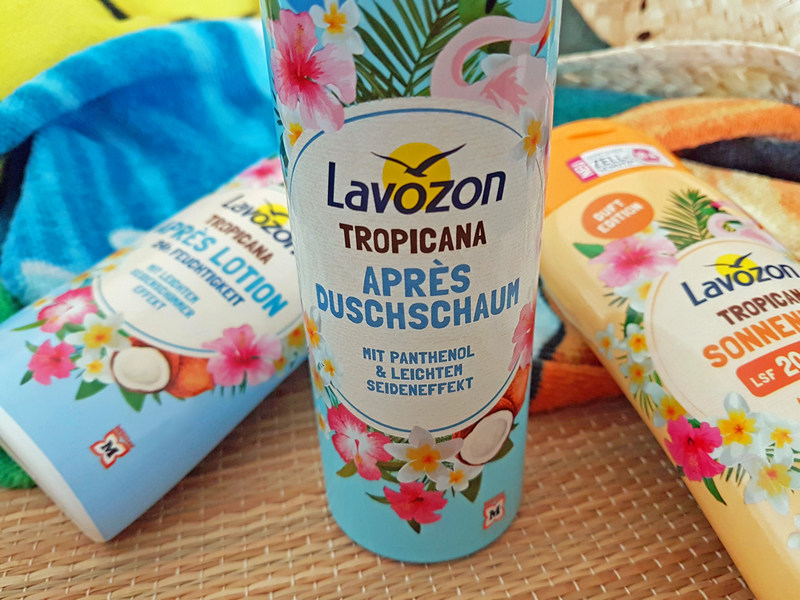 Als bekennendes Verpackungsopfer habe ich mich sofort in die Optik der Lavozon Tropicana Duftedition verguckt. Lavozon ist die Eigenmarke der Drogerie Müller und hält eine große Auswahl an Sonnenpflegeprodukten zu günstigen Preisen bereit. Die Duftedition mit tropischem Duft verwöhnt außerdem noch unsere Näschen.